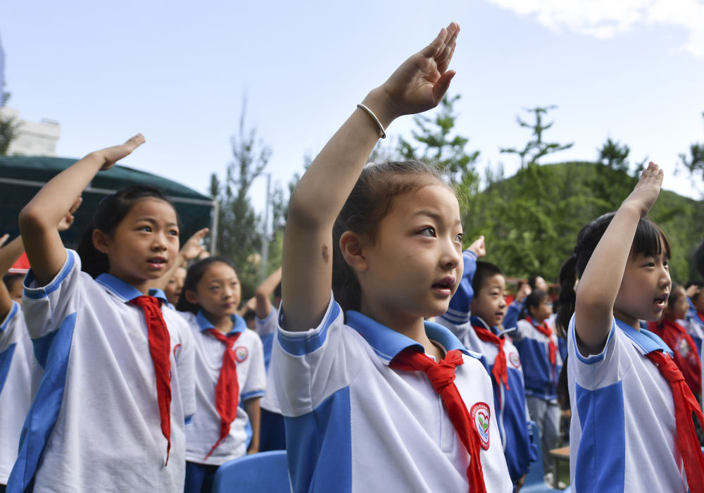 2021年7月1日,在陜西延安楊家?guī)X福州希望小學,學生在收看慶祝中國共產(chǎn)黨成立100周年大會時唱國歌。