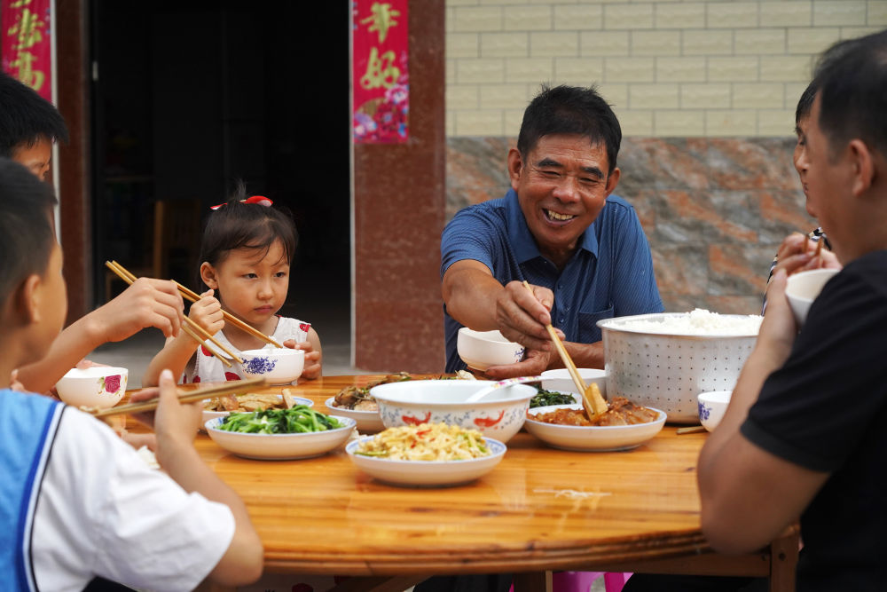 2021年7月1日,江西省瑞金市葉坪鎮(zhèn)禾倉村村民曾得濤(中)和家人一起吃早飯。