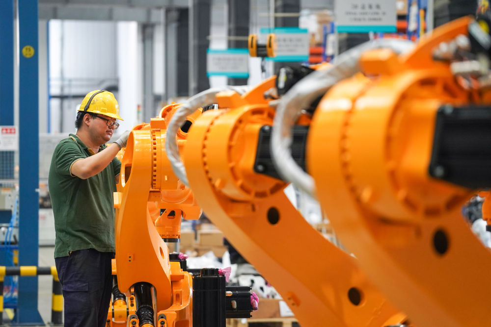 2021年7月1日,在位于南京市江寧區(qū)的南京埃斯頓自動化股份有限公司工業(yè)機器人生產(chǎn)車間,工作人員對組裝好的工業(yè)機器人進行調(diào)試。