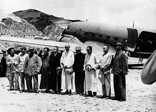 1945年7月,國(guó)民參政會(huì)參政員黃炎培等六人飛抵延安,同中國(guó)共產(chǎn)黨商談兩黨團(tuán)結(jié)、共建國(guó)內(nèi)和平問(wèn)題,毛澤東等親臨機(jī)場(chǎng)歡迎。 圖:新華社