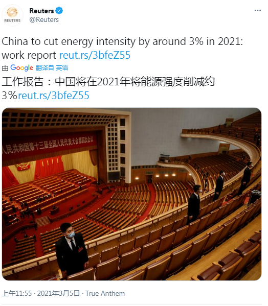 圖為兩會(huì)上的環(huán)保話題備受外媒矚目。路透社在推文中寫道,中國(guó)2021年發(fā)展主要預(yù)期目標(biāo):?jiǎn)挝粐?guó)內(nèi)生產(chǎn)總值能耗降低3%左右