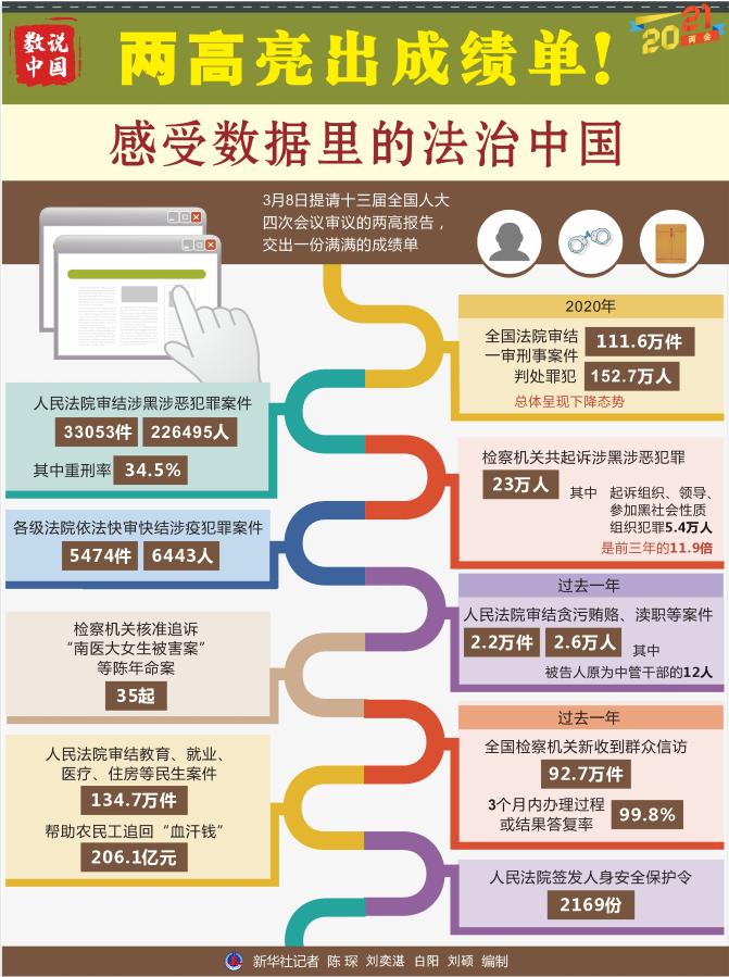 8日提請十三屆全國人大四次會議審議的兩高報告,交出一份滿滿的成績單。掃黑除惡“打傘破網(wǎng)”、嚴懲腐敗守護平安、加強民生司法保障……一串串數(shù)字勾勒出法治中國建設(shè)的亮點。