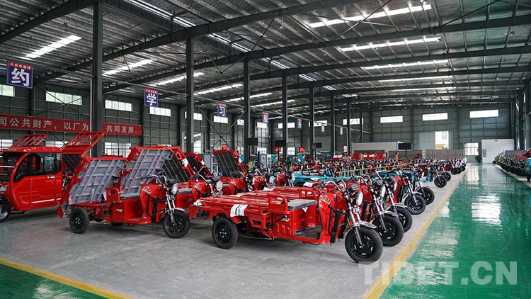 圖為生產(chǎn)線兩旁嶄新的電動(dòng)三輪車 攝影:呂靜