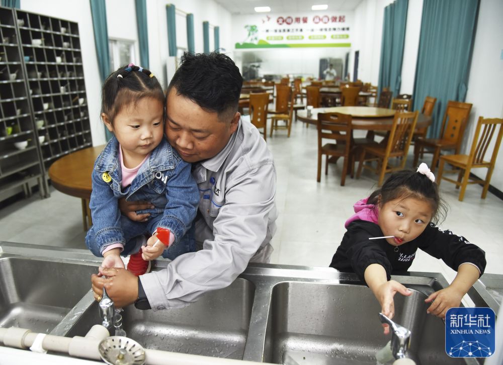 從施工現(xiàn)場(chǎng)回來(lái),楊興義在食堂為小女兒洗手(1月24日攝)。新華社記者田建川攝