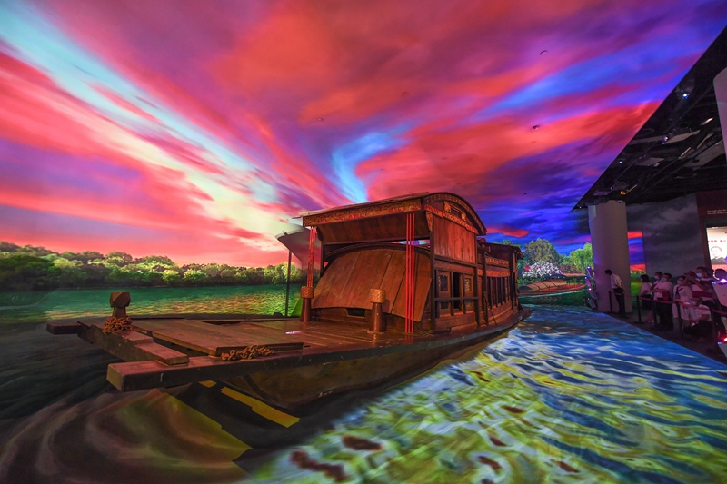 民族復興歷史任務是偉大建黨精神形成的時代背景。慶祝建黨百年之際,浙江嘉興的南湖革命紀念館迎來參觀熱潮,“紅船起航”主題展覽日均參觀人數(shù)超過10000人次。南湖革命紀念館基本陳列“紅船起航”主題展覽由“救亡圖存”、“開天辟地”、“光輝歷程”、“走向復興”4個部分組成,全面展現(xiàn)100年來,中國共產(chǎn)黨團結帶領中國人民取得革命、建設和改革偉大勝利的光輝歷史。圖為參觀者在南湖革命紀念館內參觀紅船模型及多媒體場景重現(xiàn)。新華社記者 徐昱/攝