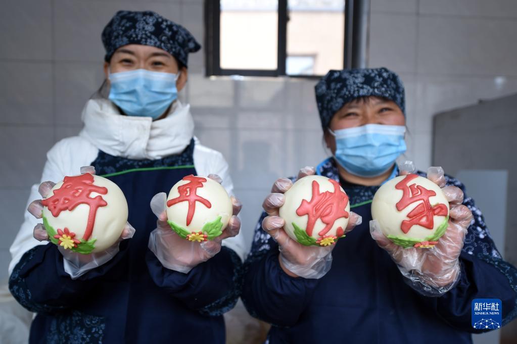 1月28日,在河北省平山縣西柏坡鎮(zhèn)北莊村團結(jié)食堂,工作人員展示制作的特色面食。新華社記者 駱學峰 攝