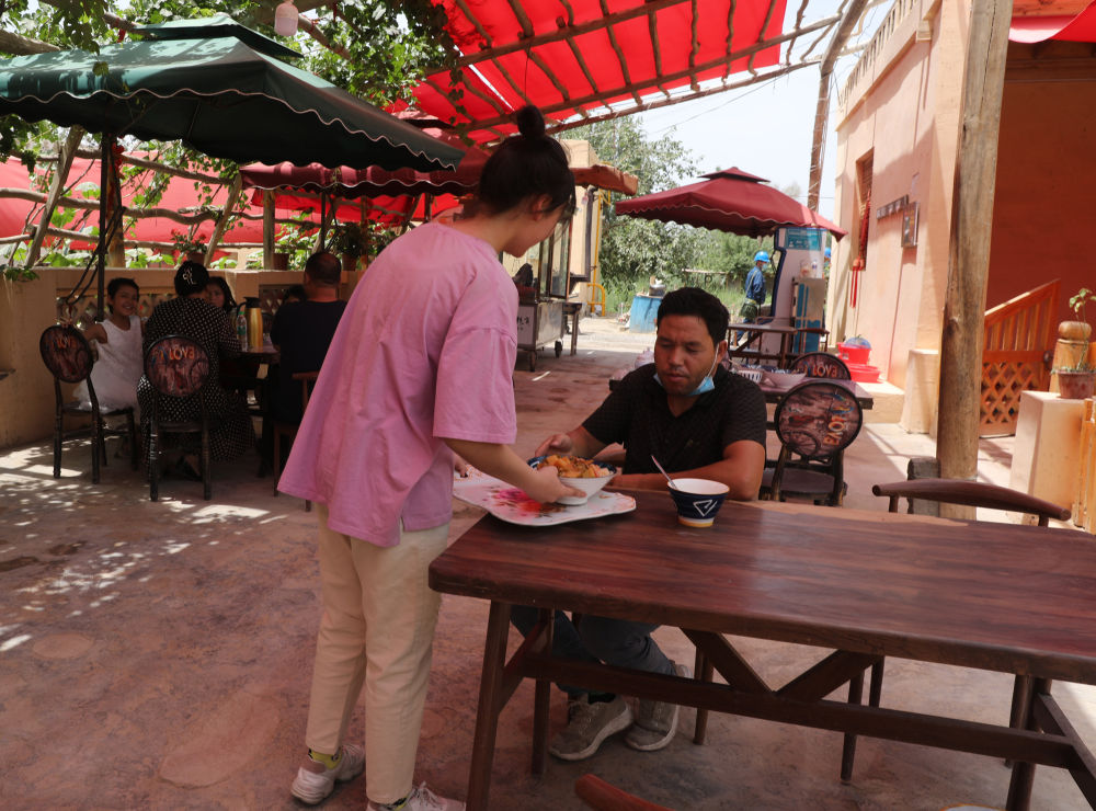 炎炎夏日,在沙漠綠洲小村農(nóng)家院葡萄架下,一邊享用油亮飄香的抓飯和熱騰騰的烤肉,再來(lái)一杯涼爽的卡瓦斯(新疆本地特色飲料),實(shí)在愜意!近年來(lái),新疆和田地區(qū)一些縣市積極打造具有濃厚地域特色的“網(wǎng)紅村”,吸引更多游客走進(jìn)和田,助力當(dāng)?shù)刈呱蠈?shí)現(xiàn)鄉(xiāng)村振興的新路。