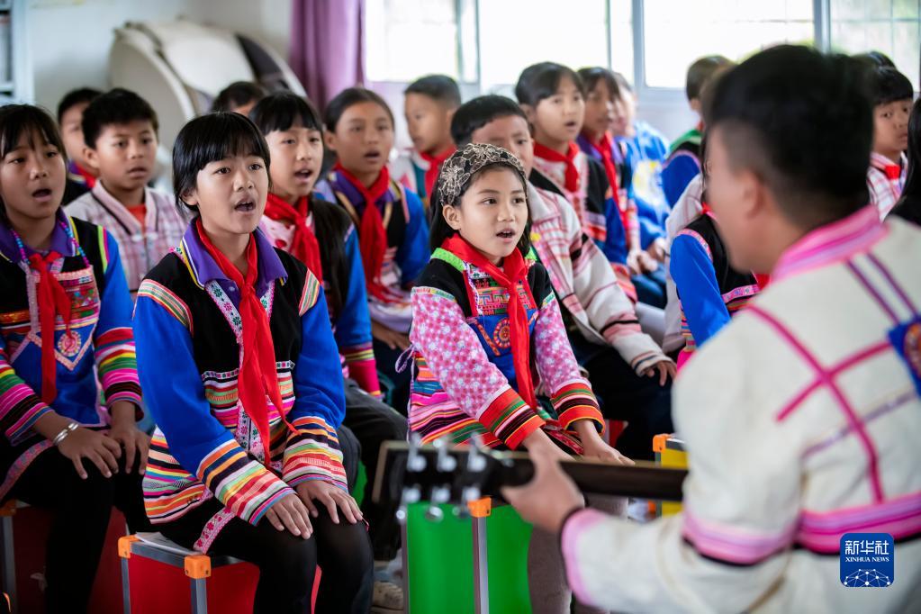 學(xué)生在云南省西雙版納傣族自治州景洪市基諾山基諾族鄉(xiāng)民族小學(xué)音樂課上唱歌(2021年12月13日攝)。新華社記者 陳欣波 攝