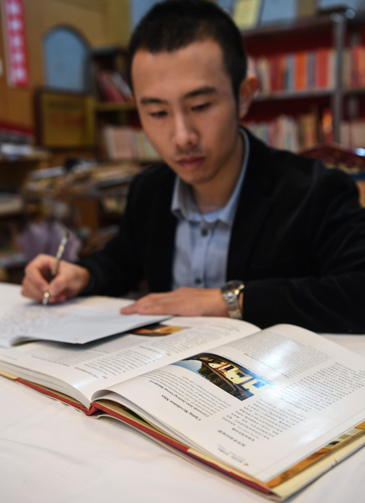 毛浩夫在研讀有關(guān)井岡山的英文資料,豐富英文講解素材。新華社記者 申宏 攝