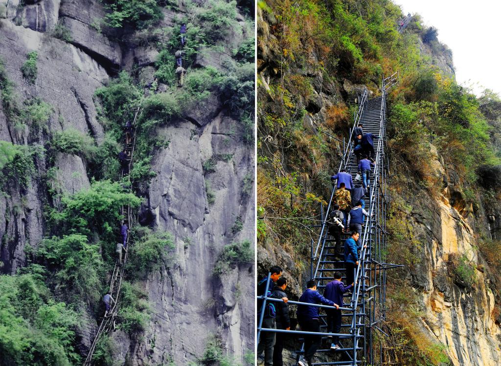 懸崖峭壁上,一個(gè)是歪歪扭扭的簡易藤梯,另一個(gè)則是改建后同時(shí)用于旅游的鋼梯。