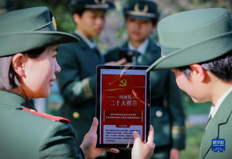 10月17日,武警重慶總隊執(zhí)勤第一支隊組織官兵學(xué)習(xí)黨的二十大報告。新華社發(fā)(唐志勇 攝)