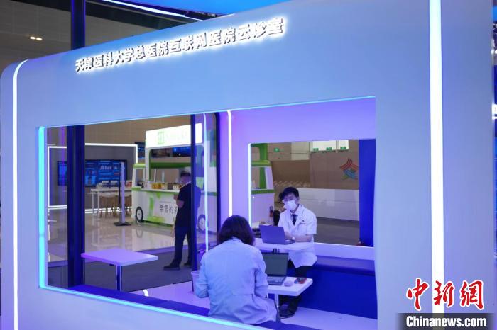 在天津醫(yī)科大學(xué)總醫(yī)院展廳,醫(yī)生在“云診室”通過互聯(lián)網(wǎng)醫(yī)院接診患者。記者了解到,在大會(huì)上,天津醫(yī)科大學(xué)總醫(yī)院宣布與科瑞泰醫(yī)療信息技術(shù)(天津)有限公司、360數(shù)字安全集團(tuán)天津公司、銳捷網(wǎng)絡(luò)股份有限公司、中國移動(dòng)通信集團(tuán)天津有限公司等開展合作,共同開啟互聯(lián)網(wǎng)醫(yī)院醫(yī)聯(lián)體“1236N”醫(yī)療健康服務(wù)新體系的建設(shè)之路。