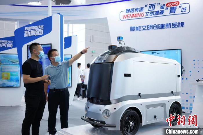 參觀者在天津西青展區(qū)參觀自動(dòng)駕駛安防巡邏車。 佟郁 攝