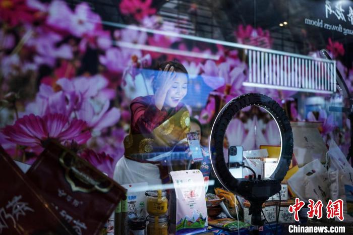 來自甘南州的主播在展位上進(jìn)行短視頻直播帶動(dòng)家鄉(xiāng)特產(chǎn)銷售,幫助更多鄉(xiāng)親致富增收。 佟郁 攝