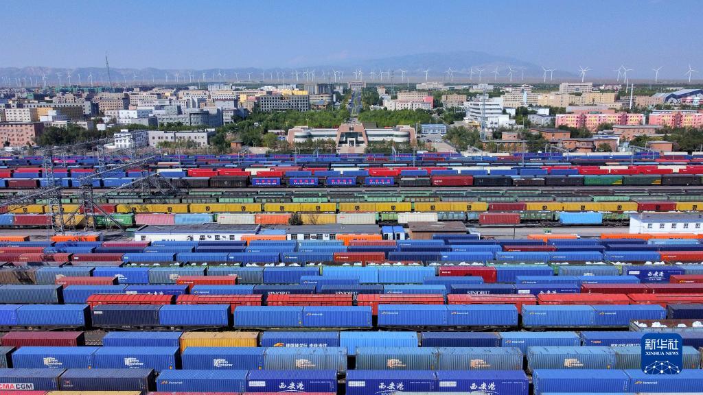 在新疆阿拉山口站寬準(zhǔn)軌編組場,出入境中歐班列集結(jié)等待出發(fā)(2022年9月10日攝,無人機(jī)照片)。新華社發(fā)(陳乾 攝)