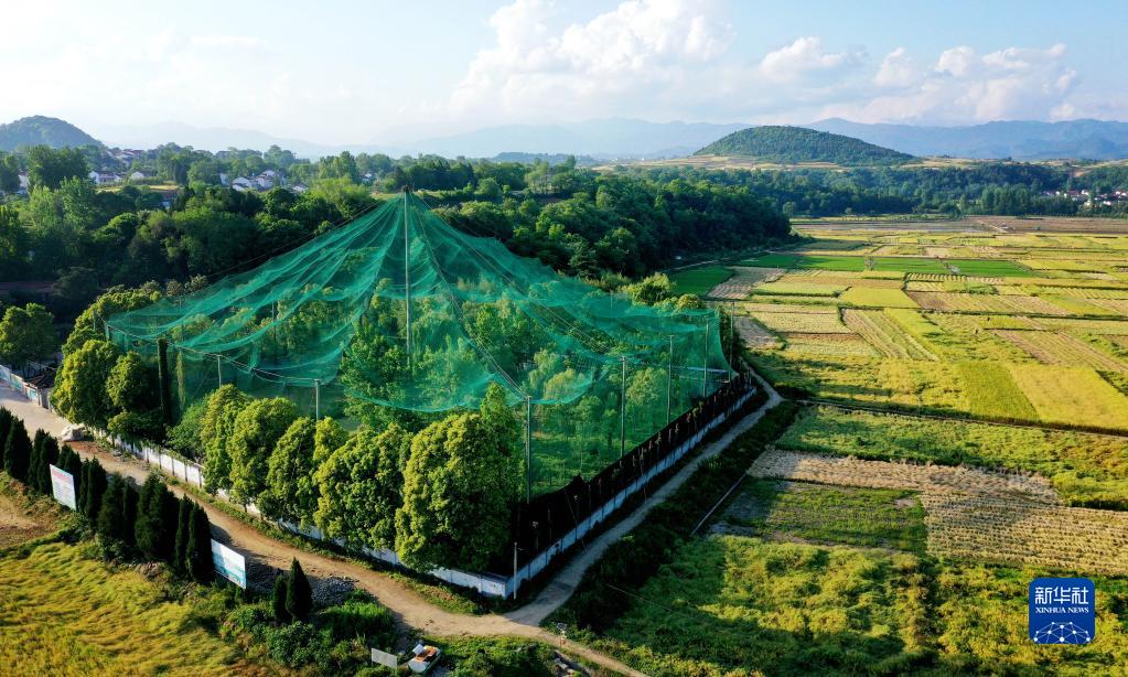 位于漢中市洋縣的陜西朱鹮人工繁育中心放飛大籠(2021年5月12日攝,無人機照片)。新華社記者 陶明 攝
