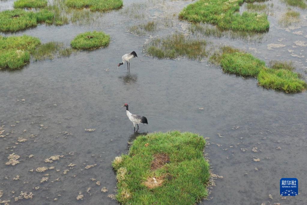 這是在甘肅省甘南藏族自治州碌曲縣尕海湖拍攝的國(guó)家一級(jí)保護(hù)動(dòng)物黑頸鶴及其幼鳥(niǎo)(無(wú)人機(jī)照片,2021年6月2日攝)。新華社記者 杜哲宇 攝