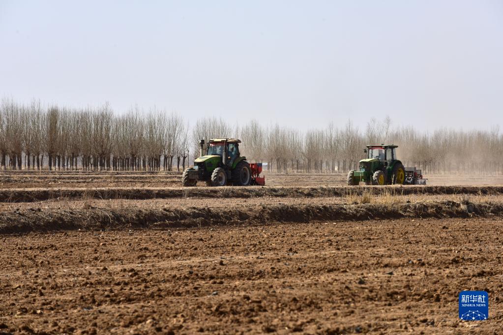 在寧夏銀川市賀蘭縣立崗鎮(zhèn)蘭星村,農(nóng)民駕駛農(nóng)機(jī)播種春小麥(2023年3月3日攝)。新華社記者 李旭倫 攝