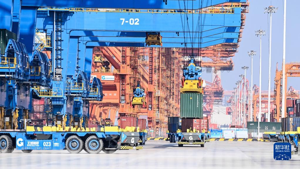 在廣西欽州港自動(dòng)化集裝箱碼頭,無人駕駛車輛在轉(zhuǎn)運(yùn)集裝箱(2023年2月25日攝)。新華社記者 張愛林 攝