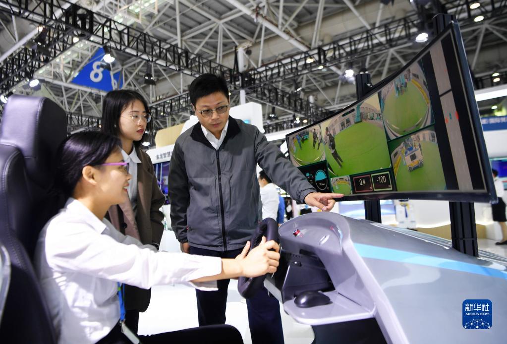 4月26日,在第六屆數(shù)字中國建設(shè)成果展覽會上,觀眾體驗金龍5G遠程駕駛。新華社記者 魏培全 攝