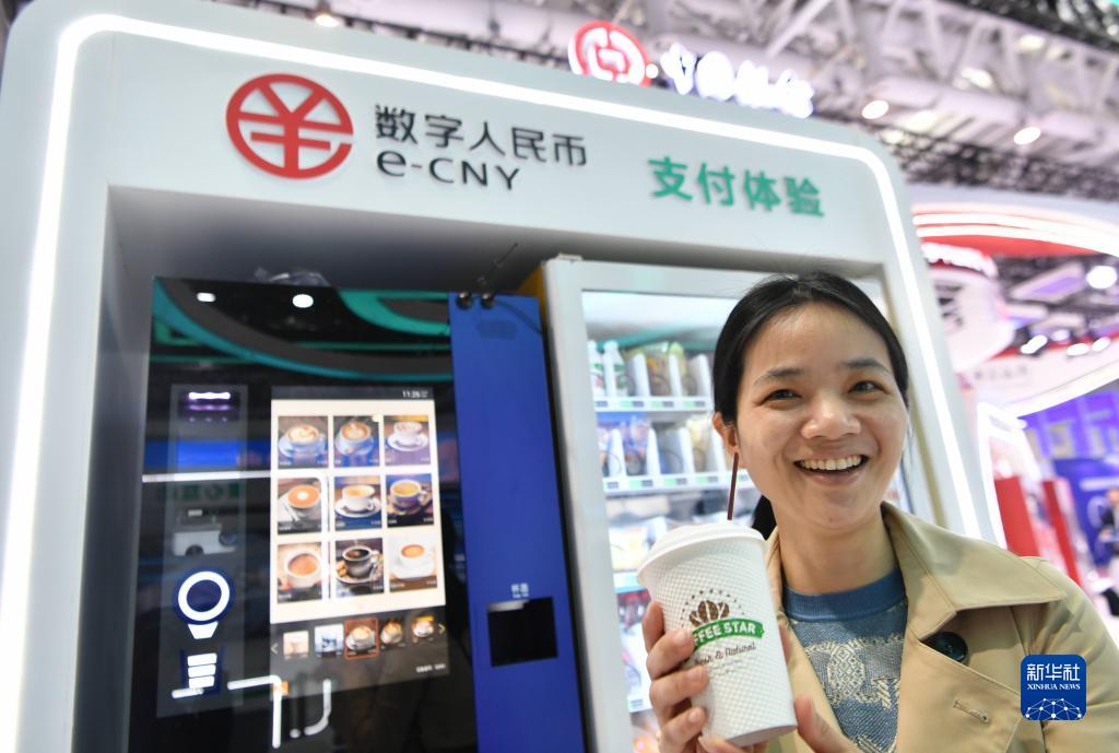 4月26日,在第六屆數(shù)字中國建設(shè)成果展覽會現(xiàn)場,一名觀眾展示用數(shù)字人民幣購買的咖啡。新華社記者 魏培全 攝