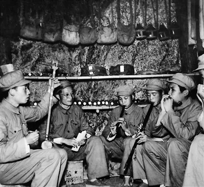 《歌唱祖國》的作者王莘(左二)在抗美援朝戰(zhàn)場防空洞內教志愿軍戰(zhàn)士演奏這首歌曲。