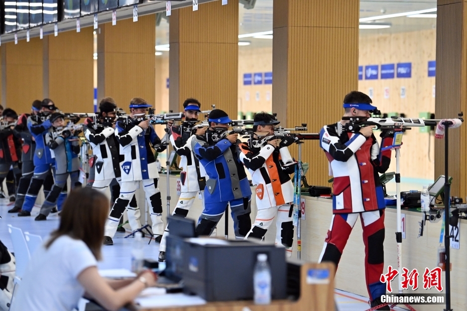 7月31日,第31屆世界大學(xué)生夏季運動會男子10米氣步槍團體決賽在成都市射擊運動學(xué)校舉行,印度隊、中國隊、哈薩克斯坦隊分獲冠亞季軍。圖為男子10米氣步槍團體決賽比賽現(xiàn)場。中新社記者 九美旦增 攝