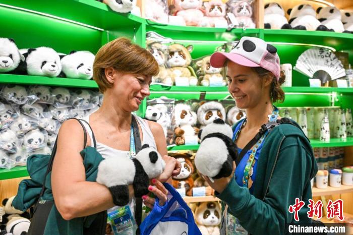 8月1日,成都大運會期間,成都大熊貓繁育研究基地成為參賽代表團的熱門打卡點,圖為匈牙利選手凡妮(右)選購大熊貓玩偶。中新社記者 趙文宇 攝