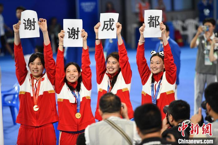 當(dāng)四位中國(guó)女將高高舉起“謝謝成都”四個(gè)大字,成都東安湖體育公園游泳跳水館沸騰了。7日晚,中國(guó)大學(xué)生游泳隊(duì)運(yùn)動(dòng)員柳雅欣、朱蕾桔、張雨霏和李冰潔在頒獎(jiǎng)儀式后拿出了這份特別的禮物:感謝觀眾的陪伴與支持,也感謝成都的熱情與包容。