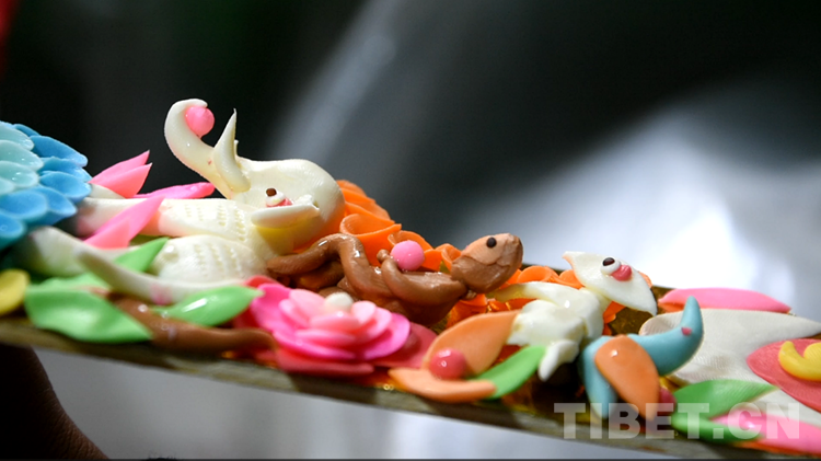酥油花是藏民族雕塑藝術的一種特殊形式,它是以人物、花卉、樹木、飛禽、走獸等為主題的一種手工油塑藝術,具有悠久的歷史。藏歷新年期間,西藏群眾會在切瑪盒的左右兩邊分別裝滿糌粑和炒青稞,然后在上面插上象征五谷豐登的“羅薩美朵”(彩色青稞穗)和寓意吉祥的酥油花。(中國西藏網 記者/次旦拉姆)
