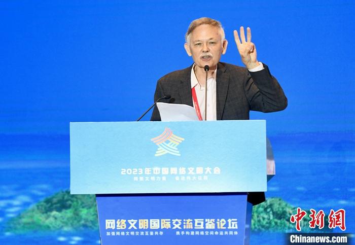 7月18日,2023年中國網(wǎng)絡文明大會網(wǎng)絡文明國際交流互鑒論壇在廈門舉辦。圖為廈門大學美籍教授潘維廉作主題演講。中新社記者 王東明 攝