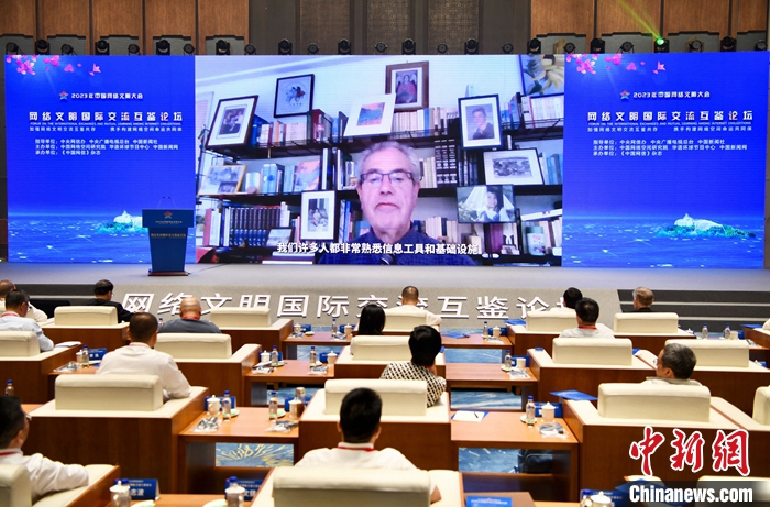 7月18日,2023年中國網(wǎng)絡文明大會網(wǎng)絡文明國際交流互鑒論壇在廈門舉辦。圖為比利時國際聯(lián)合倡議多邊合作組織榮譽主席米歇爾·杰諾韋塞作視頻演講。中新社記者 王東明 攝