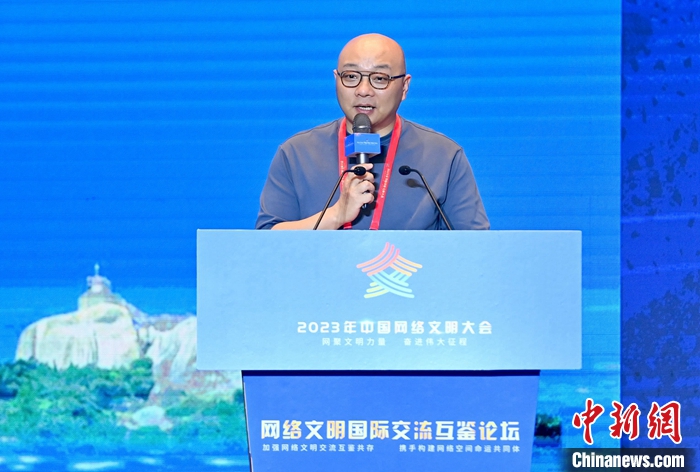 7月18日,2023年中國(guó)網(wǎng)絡(luò)文明大會(huì)網(wǎng)絡(luò)文明國(guó)際交流互鑒論壇在廈門(mén)舉辦。圖為完美世界首席執(zhí)行官蕭泓作主題演講。中新社記者 王東明 攝