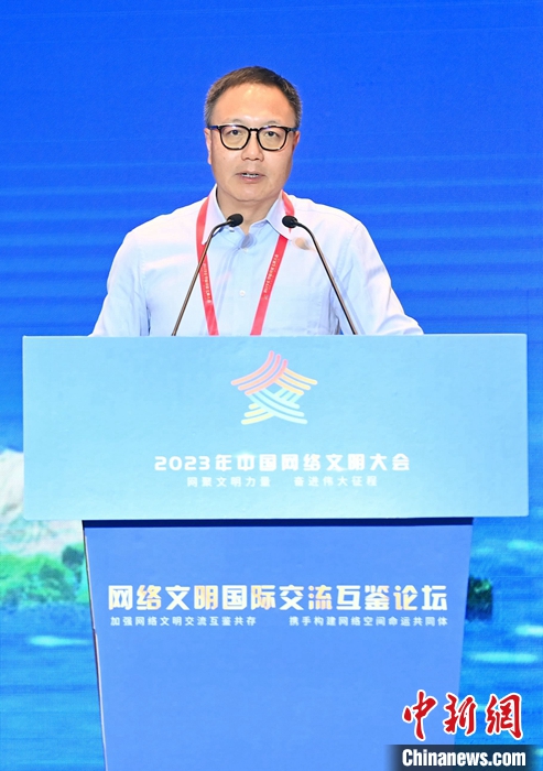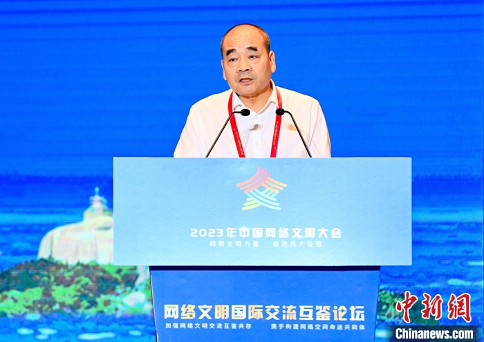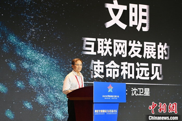 7月18日,2023年中國(guó)網(wǎng)絡(luò)文明大會(huì)網(wǎng)絡(luò)文明國(guó)際交流互鑒論壇在廈門(mén)舉辦。圖為光明日?qǐng)?bào)原副總編輯、浙大城市學(xué)院文明與傳播研究院研究員沈衛(wèi)星作主題演講。中新社記者 王東明 攝