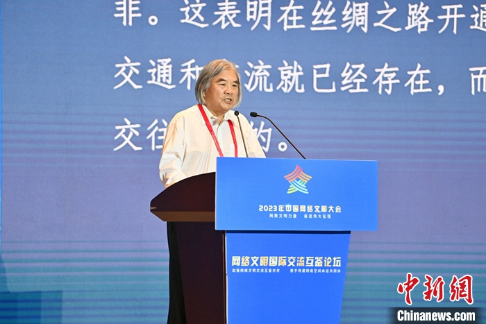 7月18日,2023年中國(guó)網(wǎng)絡(luò)文明大會(huì)網(wǎng)絡(luò)文明國(guó)際交流互鑒論壇在廈門(mén)舉辦。圖為絲綢之路考古合作研究中心首席科學(xué)家王建新作主題演講。中新社記者 王東明 攝