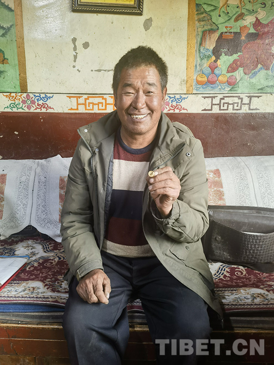 索杰醫(yī)生取出第三個(gè)包的時(shí)候,格外小心翼翼。我們因此也就更好奇,里面又是什么“寶藏”?!拔?986年入黨,1997年當(dāng)村大隊(duì)的副隊(duì)長(zhǎng)。2010年,鄉(xiāng)里在12個(gè)村的大隊(duì)長(zhǎng)中,選兩名優(yōu)秀人員,我就是其中之一?!彼鹘茚t(yī)生邊說,邊慢慢拿出一個(gè)盒子,打開盒蓋,把手在衣服角上抹抹,然后取出一枚金黃閃亮的毛主席像章。“當(dāng)時(shí)我們縣一共去了20人,先到那曲市委黨校學(xué)習(xí)了8天,然后到北京和大連分別參觀學(xué)習(xí)7天。在北京,我去了毛主席紀(jì)念堂、天安門、長(zhǎng)城、鳥巢、水立方。我在天安門廣場(chǎng)買了鮮花,到毛主席紀(jì)念堂門口時(shí),先是有點(diǎn)緊張,因?yàn)槟抢镎緧彽能娙?。我把鮮花放在一個(gè)統(tǒng)一的地方,瞻仰毛主席遺容時(shí),我緊張的心情一下子沒有了,都變成了激動(dòng)?!彼鹘茚t(yī)生把手放在心臟的位置比劃著,“為了紀(jì)念毛主席,我就買了一枚毛主席像章。”