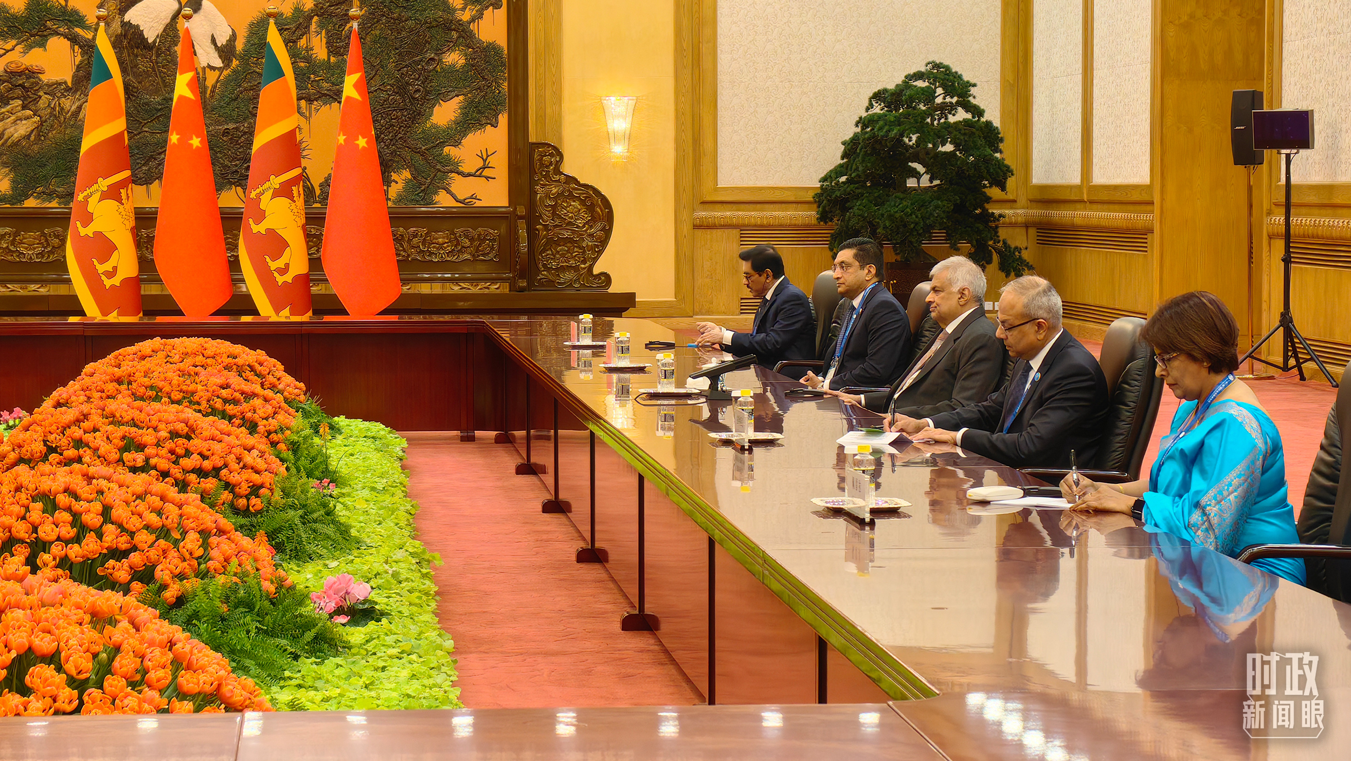 會(huì)見(jiàn)現(xiàn)場(chǎng)擺放的中國(guó)、斯里蘭卡國(guó)旗。(總臺(tái)央視記者范一鳴拍攝)