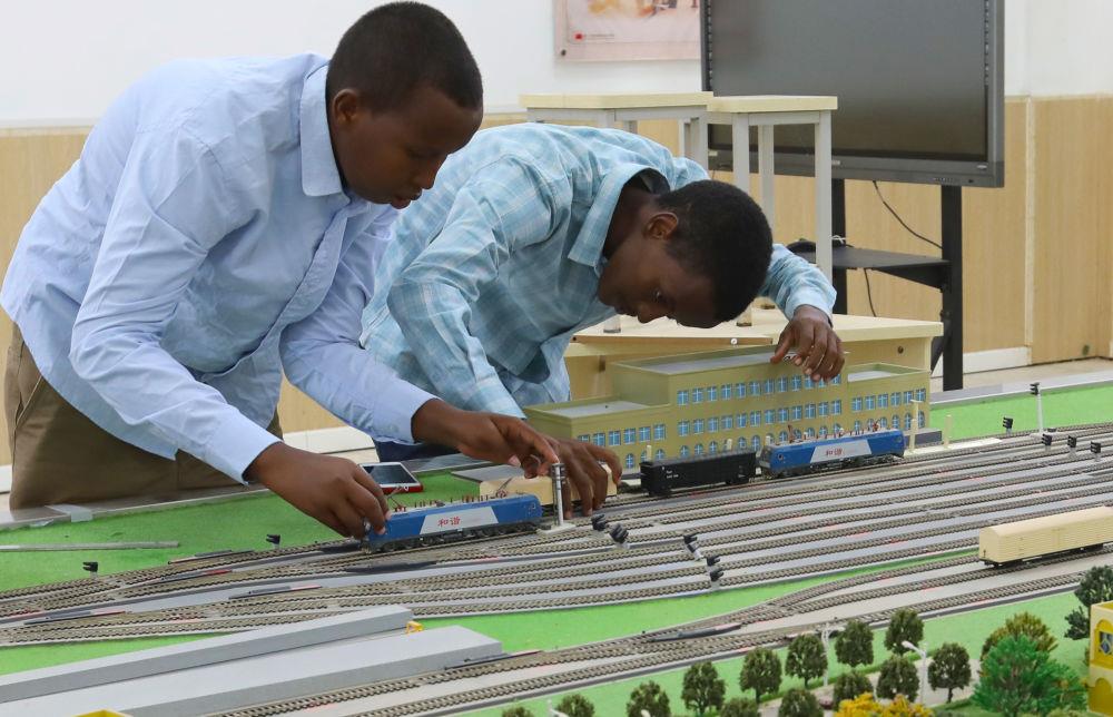 2022年9月19日,在位于吉布提首都吉布提市的工商學校,學生在魯班工坊鐵道運營沙盤教學區(qū)學習。