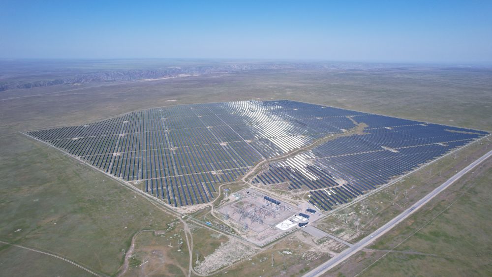 這是5月4日拍攝的哈薩克斯坦阿拉木圖州卡普恰蓋100兆瓦光伏電站(無人機(jī)照片)。這里的太陽能光伏板通過中歐班列運(yùn)輸至此。