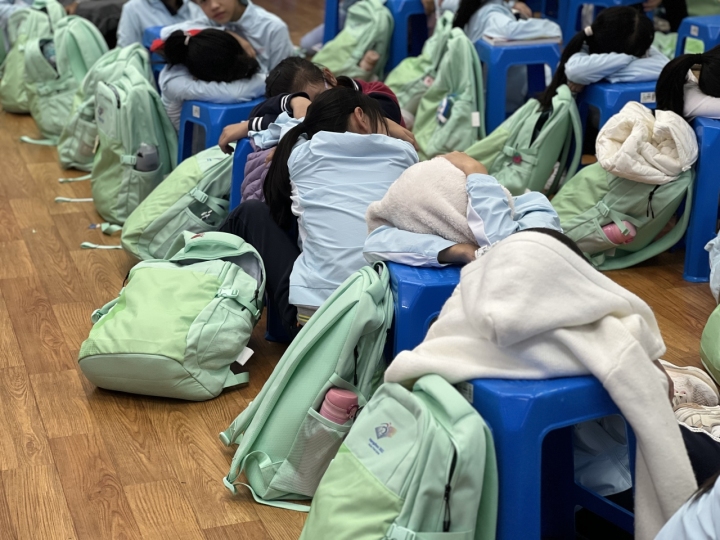 除了排練,他們還有作業(yè)和日常生活。排練現(xiàn)場(chǎng),時(shí)常能見到孩子們?cè)趭^筆疾書或者抓住碎片時(shí)間小憩,作業(yè)和打卡一次都沒(méi)落下?!拔覀?nèi)粘Mㄖ啪毜臅r(shí)候,也會(huì)喊他們帶上作業(yè),即便在開幕式上,后臺(tái)還碼著他們的書包,作業(yè)都是隨身攜帶的。”