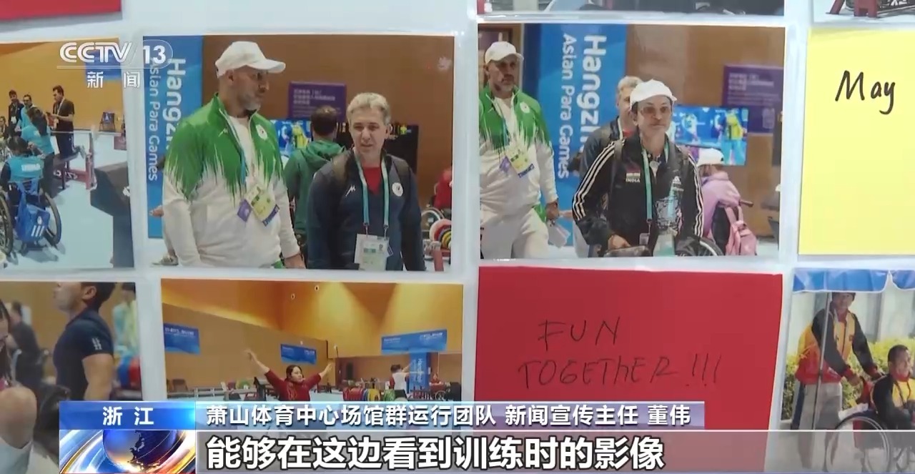 杭州蕭山體育中心體育館,是杭州第4屆亞殘運(yùn)會(huì)舉重項(xiàng)目的比賽場館,10月23日,舉重項(xiàng)目已經(jīng)在這里正式開賽。場館的工作人員為了給運(yùn)動(dòng)員放松心情,并鼓勵(lì)他們比賽,特意制作了一面照片墻。