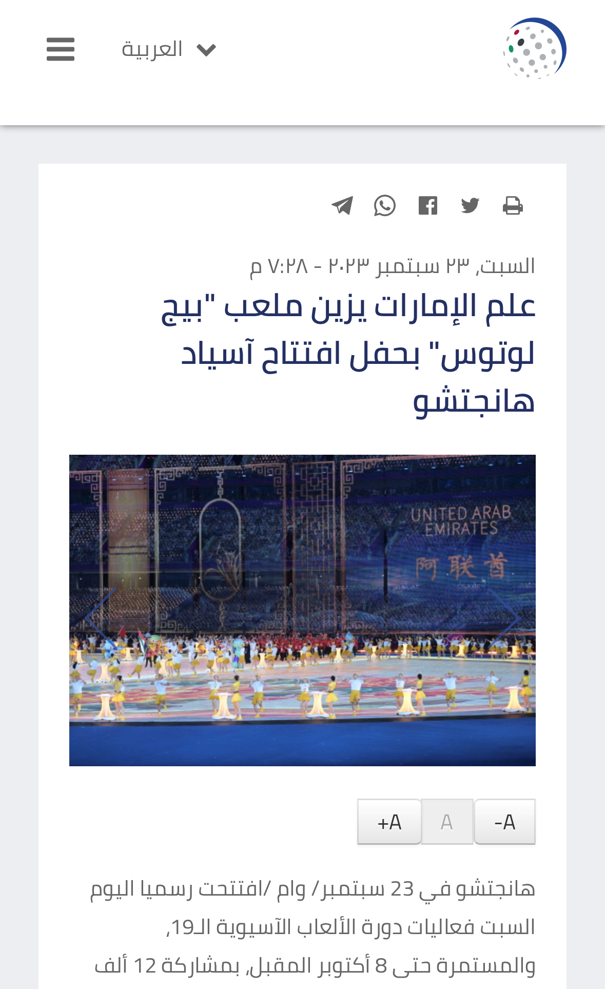 同樣在23日,阿聯(lián)酋國(guó)家通訊社(Emirates News Agency)發(fā)表題為《阿聯(lián)酋國(guó)旗點(diǎn)綴杭州亞運(yùn)會(huì)“大蓮花”體育場(chǎng)》的報(bào)道。報(bào)道稱,中國(guó)國(guó)家主席習(xí)近平當(dāng)晚宣布了亞運(yùn)會(huì)的開幕。杭州亞運(yùn)會(huì)的開幕式精彩紛呈,突出展現(xiàn)了主辦國(guó)的文化遺產(chǎn),重點(diǎn)關(guān)注可持續(xù)發(fā)展和環(huán)境保護(hù)領(lǐng)域的實(shí)踐,同時(shí)凸顯古代文明獨(dú)有的特征。杭州亞運(yùn)會(huì)的舉辦正是收獲果實(shí)、收獲喜悅的時(shí)刻,東道主將與亞洲各國(guó)來(lái)賓共同分享。