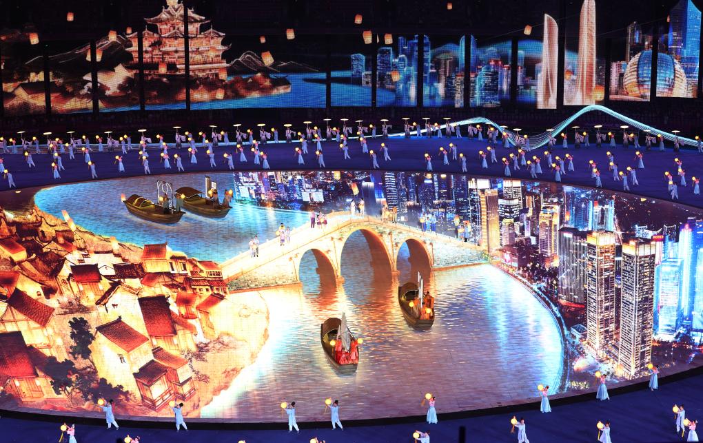 這是9月23日拍攝的杭州亞運(yùn)會(huì)開幕式“拱宸橋”連通古今。新華社記者 楊磊 攝