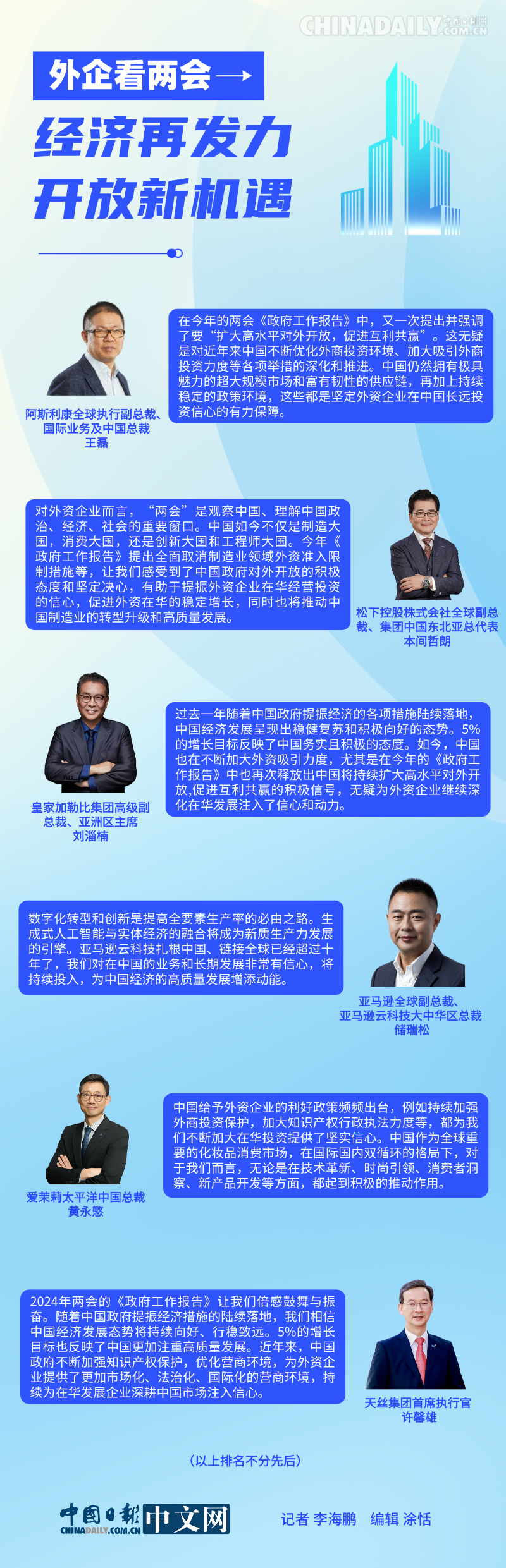 “中國是贏得未來的重要引擎”、“5%的經(jīng)濟(jì)增長目標(biāo)反映了中國理性務(wù)實的發(fā)展態(tài)度,同時也反映了中國更加注重高質(zhì)量發(fā)展”、 “《政府工作報告》中再次釋放出中國將持續(xù)擴(kuò)大高水平對外開放、促進(jìn)互利共贏的積極信號,為外資企業(yè)繼續(xù)深化在華發(fā)展注入了信心和動力”、“與中國‘脫鉤’是不現(xiàn)實的,在經(jīng)濟(jì)全球化時代,各國深化合作才能讓經(jīng)濟(jì)可持續(xù)發(fā)展”……眾多外企紛紛表示,中國經(jīng)濟(jì)的穩(wěn)定發(fā)展將會繼續(xù)為外資企業(yè)提供廣闊的空間和豐富的機(jī)遇,于此同時,他們也將持續(xù)投入、加碼中國市場,為中國經(jīng)濟(jì)高質(zhì)量發(fā)展提供動力。
