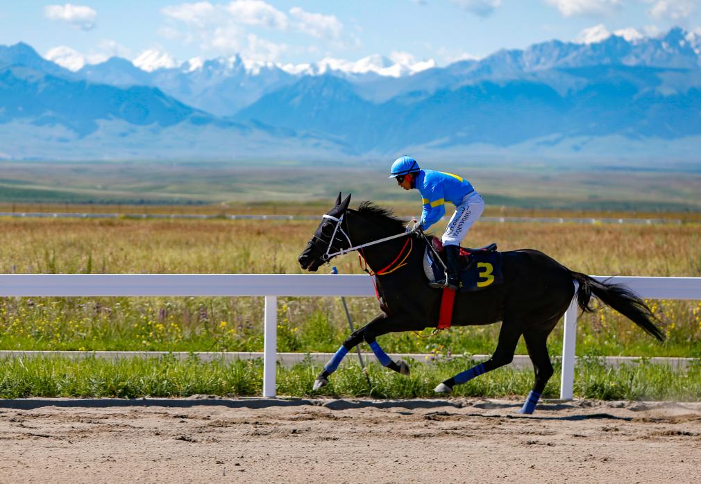 7月13日,湖北代表隊選手覃勇和賽馬“雁春金冠”在比賽中。當(dāng)日,第十二屆全國少數(shù)民族傳統(tǒng)體育運動會馬上項目民族賽馬8000米比賽在新疆昭蘇進(jìn)行。新華社記者 陳朔 攝