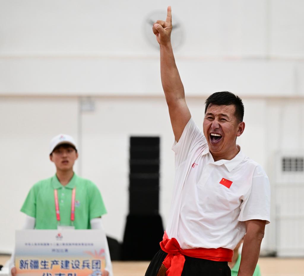 27日,第十二屆全國少數(shù)民族傳統(tǒng)體育運動會(以下簡稱“運動會”)押加比賽迎來五個組別的最終爭奪。新疆生產(chǎn)建設(shè)兵團選手提亞那克驚險取勝,獲得85公斤級一等獎。一場鏖戰(zhàn)后,他與來自海南的選手吉航敬擁抱致意。