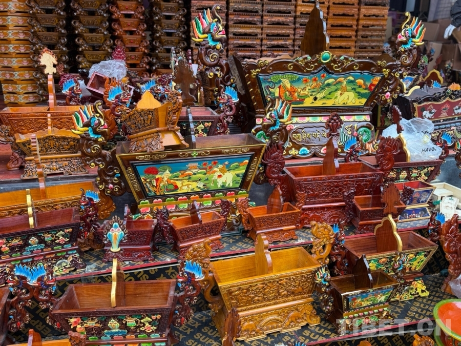 圖為切瑪盒,是藏歷新年的“儀式感核心”。“切瑪盒”是將精制斗形木盒用隔板分開,左右兩邊分別盛入炒青稞和糌粑,再插上象征五谷豐登的“羅薩梅朵”和寓意吉祥的酥油花,寓意人壽年豐、吉祥如意。