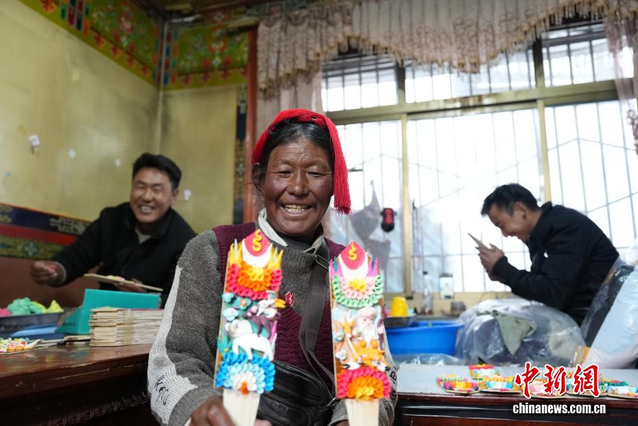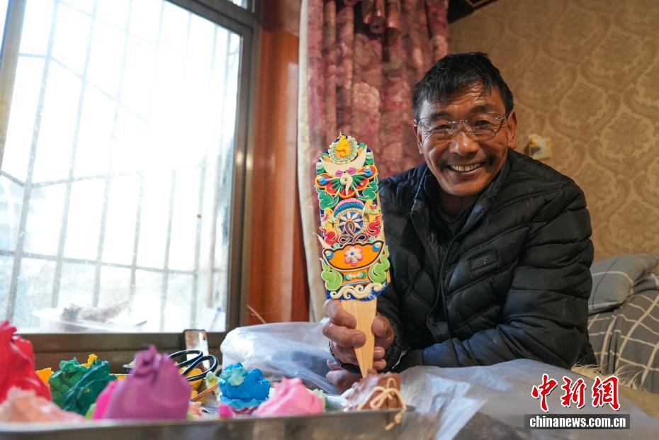 2月4日,隨著藏歷新年臨近,拉薩街頭年味漸濃,年貨市場(chǎng)上的“孜扎”迎來(lái)熱銷。酥油花藏語(yǔ)稱“孜扎”,是藏歷新年吉祥物切瑪盒的重要組件,也是藏族民眾家中必備的年貨。酥油花以酥油為主要原料,由匠人純手工捏制而成,造型涵蓋佛像、人物、花卉樹(shù)木、飛禽走獸等,常見(jiàn)圖案包含吉祥八寶、和諧四瑞、長(zhǎng)壽圖等,承載著藏族民眾對(duì)新年平安吉祥、萬(wàn)事順?biāo)斓拿篮闷碓浮D為手工藝人在制作酥油花。貢確 攝