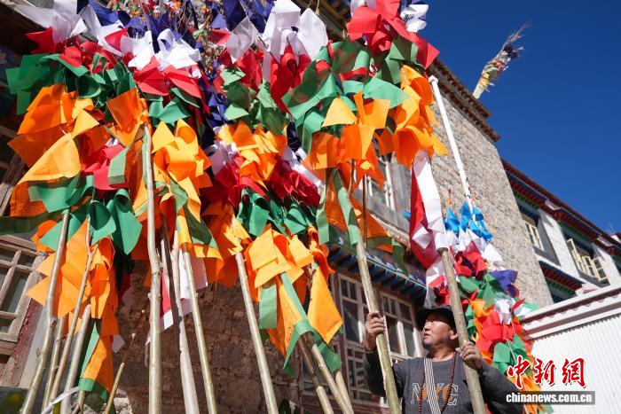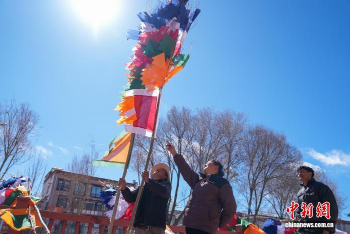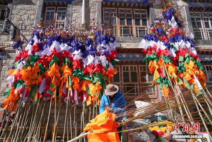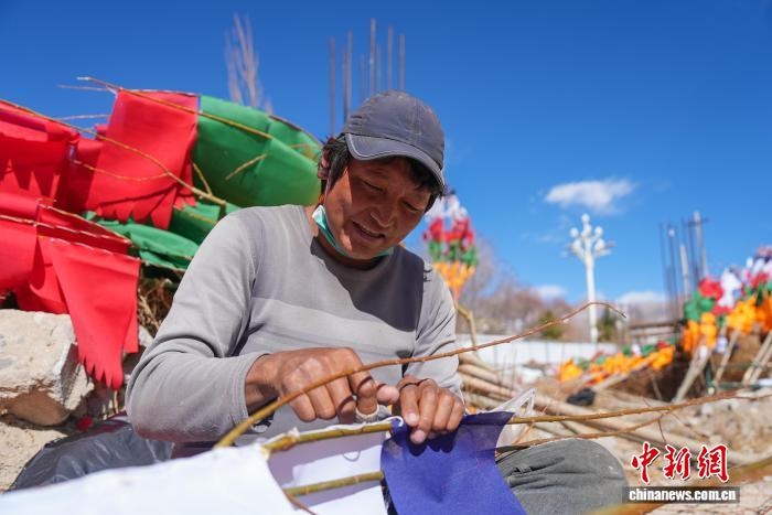 2月5日,臨近藏歷新年,在西藏自治區(qū)拉薩市街頭,農(nóng)牧民正縫制五彩經(jīng)幡樹。五彩經(jīng)幡樹是藏族民眾在藏歷新年前必備的年貨之一。藏歷新年期間,藏族民眾會(huì)選擇一個(gè)良辰吉日,為自家的房頂更換五彩經(jīng)幡樹,祈求新的一年里五谷豐登,吉祥如意。