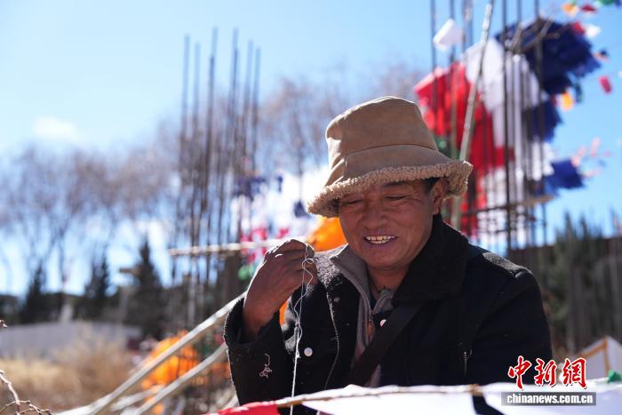 圖為多杰正在縫制五彩經(jīng)幡樹。貢確 攝